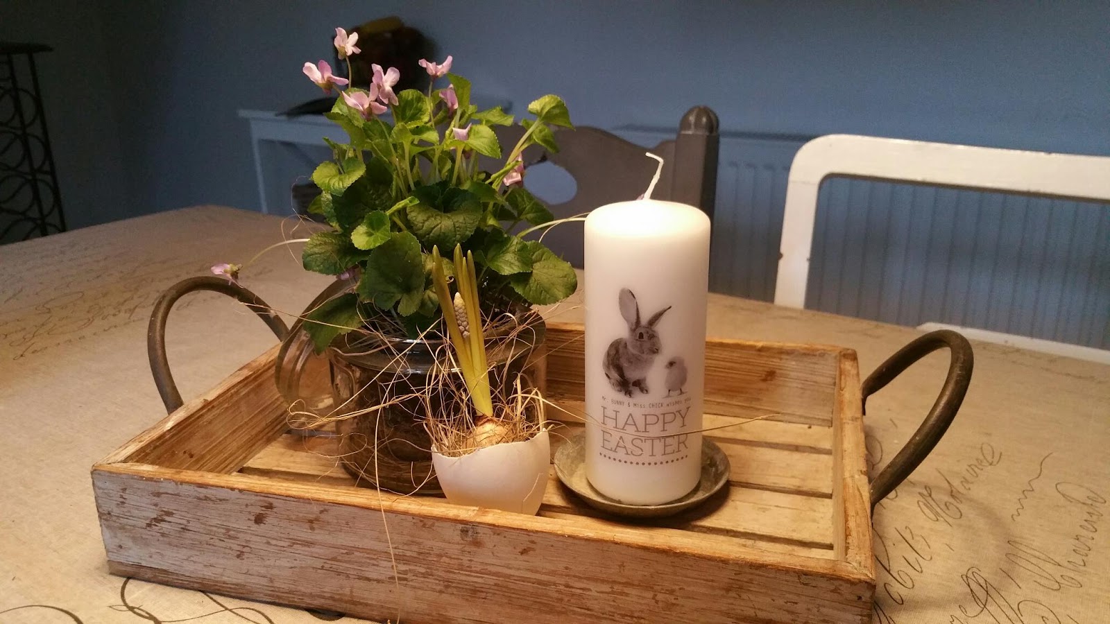 Sammen med lys og en enkelt perlehyacint i en æggeskal, udgør det et hyggeligt lille forårs/påske stilleben.
